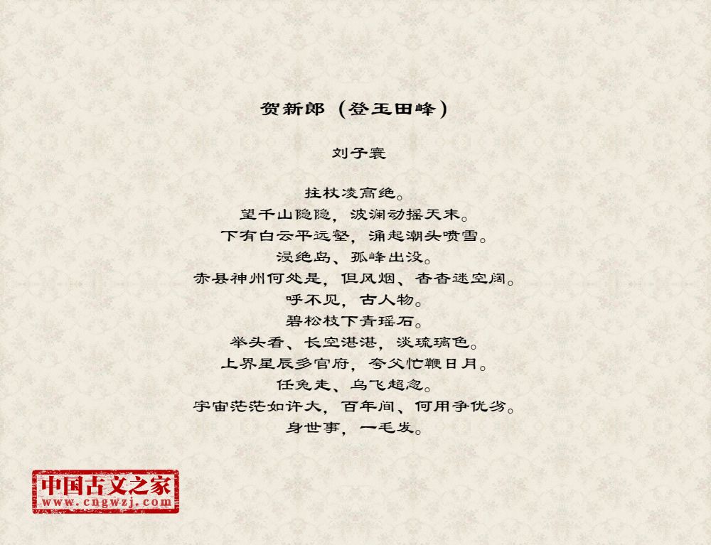拄杖凌高绝。望千山隐隐,波澜动摇天末。下有白云平远壑,涌起潮头喷雪。浸绝岛、孤峰出没。赤县神州何处是,但风烟、杳杳迷空阔。呼不见,古人物。碧松枝下青瑶石。举头看、长空湛湛,淡琉璃色。上界星辰多官府,夸父忙鞭日月。任兔走、乌飞超忽。宇宙茫茫如许大,百年间、何用争优劣。身世事,一毛发。