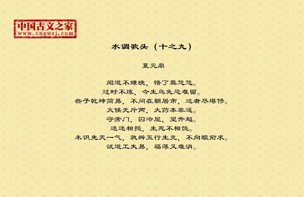 闻道不嫌晚,悟了莫悠悠。过时不炼,今生乌兔恐难留。些子乾坤简易,不问在朝居市,达者尽堪修。火候无斤两,大药本非遥。守旁门,囚冷屋,望升超。迷迷相授,生死不相饶。未识先天一气,孰辨五行生克,不向眼前求。试道工夫易,福薄又难消。