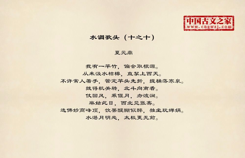 我有一竿竹,偏会取根源。从来汲水桔槔,直挈上西天。不许常人著手,管定竿头先折,提桶落寒泉。拨得机关转,北斗向南看。仗回风,乘偃月,勿波澜。麻姑此日,西北见张骞。选佛妙高峰顶,饮罢醍醐似醉,独坐玩婵娟。水湛月明处,太极更无前。
