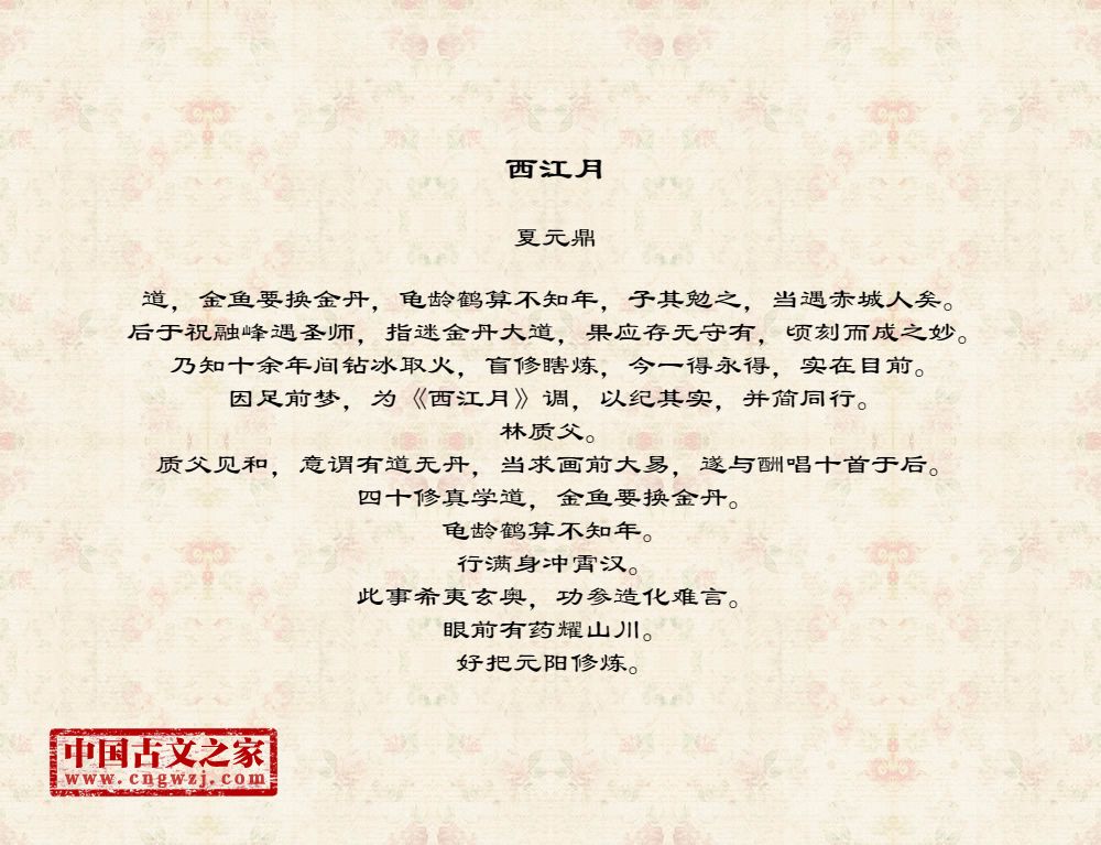 道,金鱼要换金丹,龟龄鹤算不知年,子其勉之,当遇赤城人矣。后于祝融峰遇圣师,指迷金丹大道,果应存无守有,顷刻而成之妙。乃知十余年间钻冰取火,盲修瞎炼,今一得永得,实在目前。因足前梦,为《西江月》调,以纪其实,并简同行。林质父。质父见和,意谓有道无丹,当求画前大易,遂与酬唱十首于后。四十修真学道,金鱼要换金丹。龟龄鹤算不知年。行满身冲霄汉。此事希夷玄奥,功参造化难言。眼前有药耀山川。好把元阳修炼。