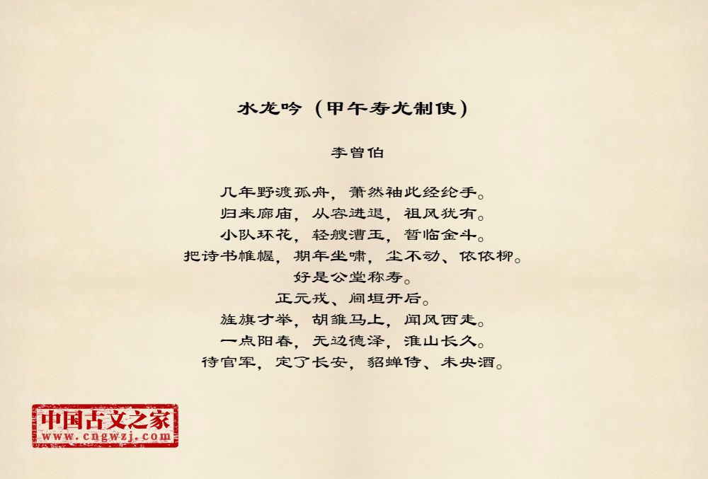 李曾伯(1198~1265至1275间)南宋词人。字长孺,号可斋。原籍覃怀(今河南沁阳附近)。南渡后寓居嘉兴(今属浙江)。