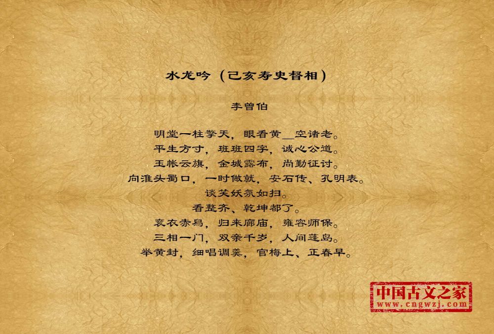 李曾伯(1198~1265至1275间)南宋词人。字长孺,号可斋。原籍覃怀(今河南沁阳附近)。南渡后寓居嘉兴(今属浙江)。