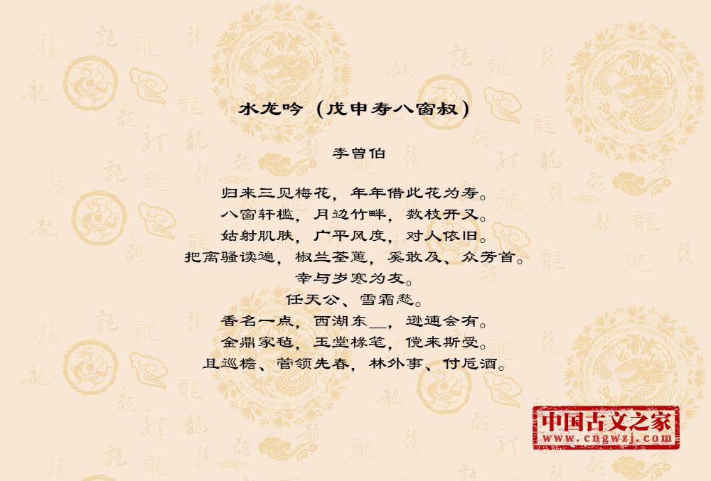 李曾伯(1198~1265至1275间)南宋词人。字长孺,号可斋。原籍覃怀(今河南沁阳附近)。南渡后寓居嘉兴(今属浙江)。