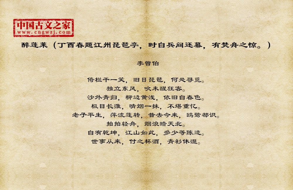 《醉蓬莱(丁酉春题江州琵琶亭,时自兵间还幕,有焚舟之惊。)》由李曾伯创作