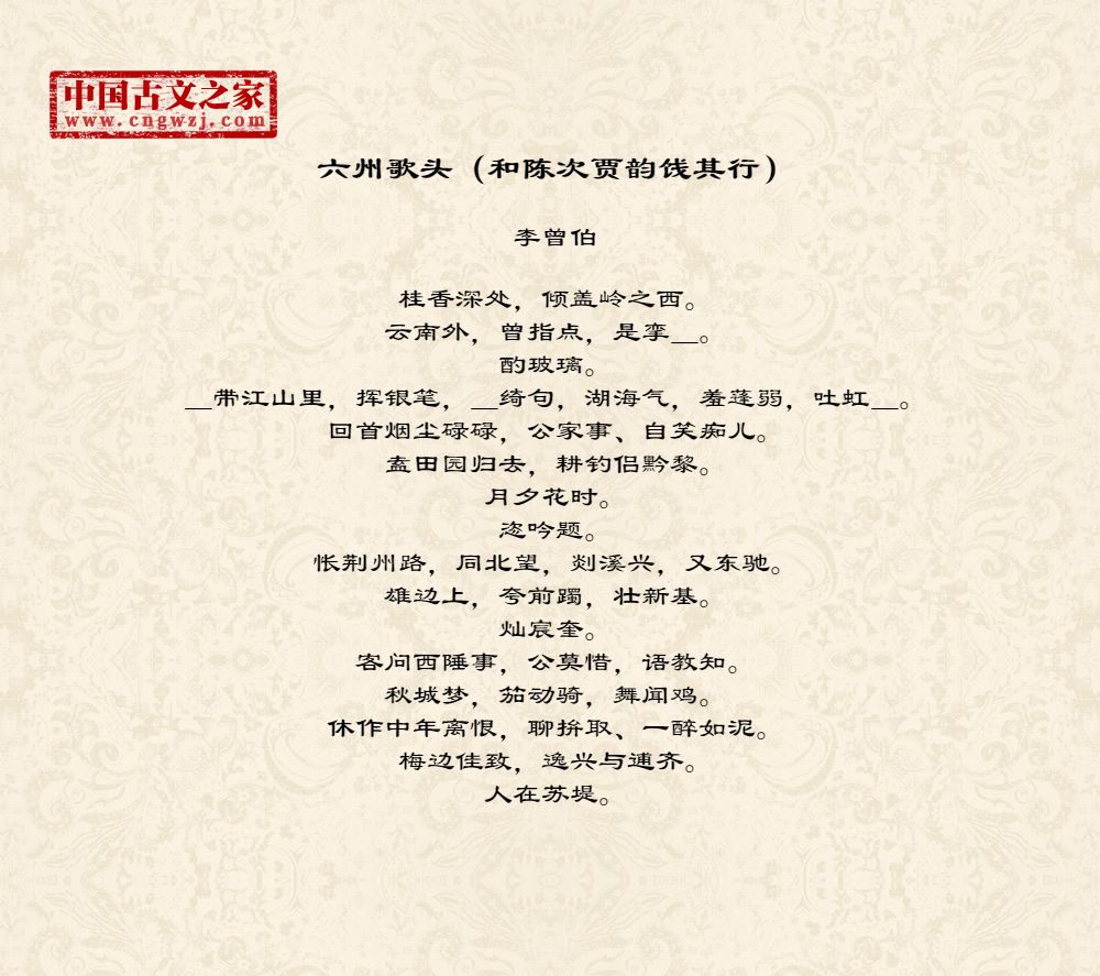 李曾伯(1198~1265至1275间)南宋词人。字长孺,号可斋。原籍覃怀(今河南沁阳附近)。南渡后寓居嘉兴(今属浙江)。