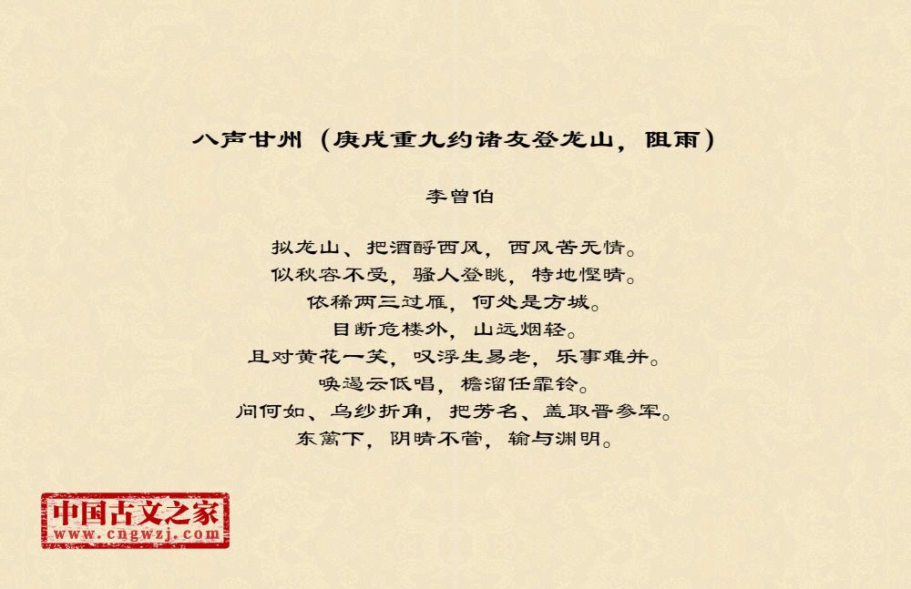 《八声甘州(庚戌重九约诸友登龙山,阻雨)》的原文打印版(李曾伯)