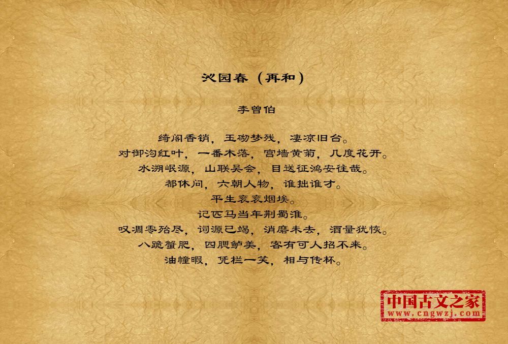 李曾伯(1198~1265至1275间)南宋词人。字长孺,号可斋。原籍覃怀(今河南沁阳附近)。南渡后寓居嘉兴(今属浙江)。