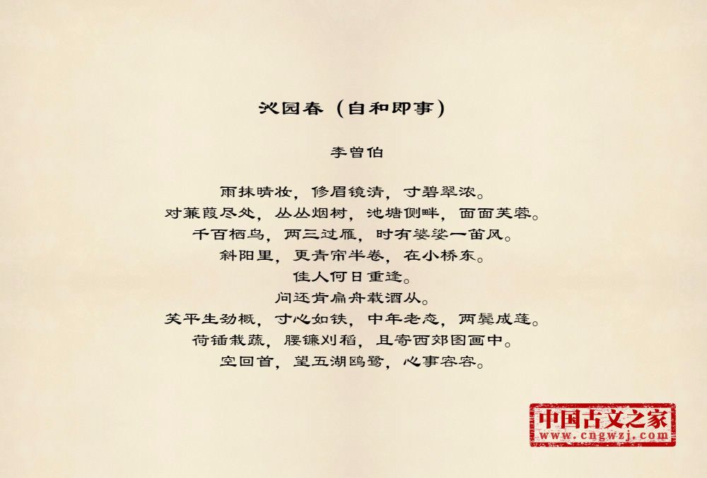 李曾伯(1198~1265至1275间)南宋词人。字长孺,号可斋。原籍覃怀(今河南沁阳附近)。南渡后寓居嘉兴(今属浙江)。