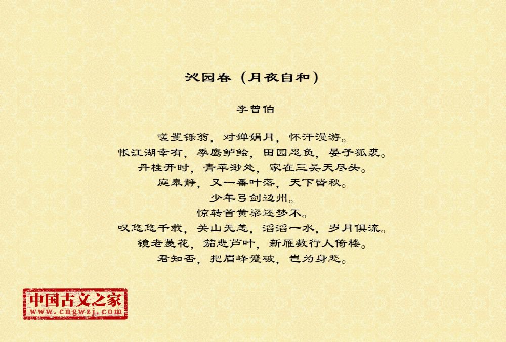 李曾伯(1198~1265至1275间)南宋词人。字长孺,号可斋。原籍覃怀(今河南沁阳附近)。南渡后寓居嘉兴(今属浙江)。