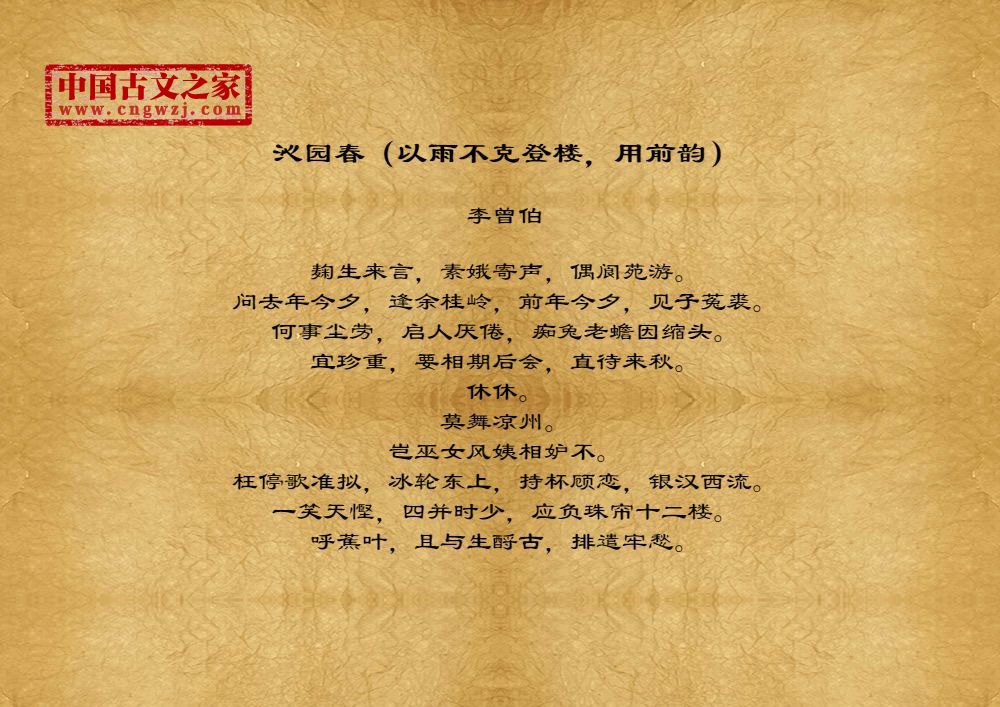 李曾伯(1198~1265至1275间)南宋词人。字长孺,号可斋。原籍覃怀(今河南沁阳附近)。南渡后寓居嘉兴(今属浙江)。