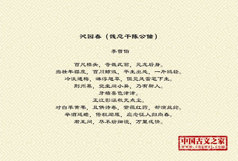 李曾伯(1198~1265至1275间)南宋词人。字长孺,号可斋。原籍覃怀(今河南沁阳附近)。南渡后寓居嘉兴(今属浙江)。