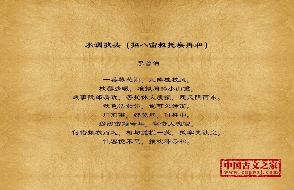 李曾伯(1198~1265至1275间)南宋词人。字长孺,号可斋。原籍覃怀(今河南沁阳附近)。南渡后寓居嘉兴(今属浙江)。