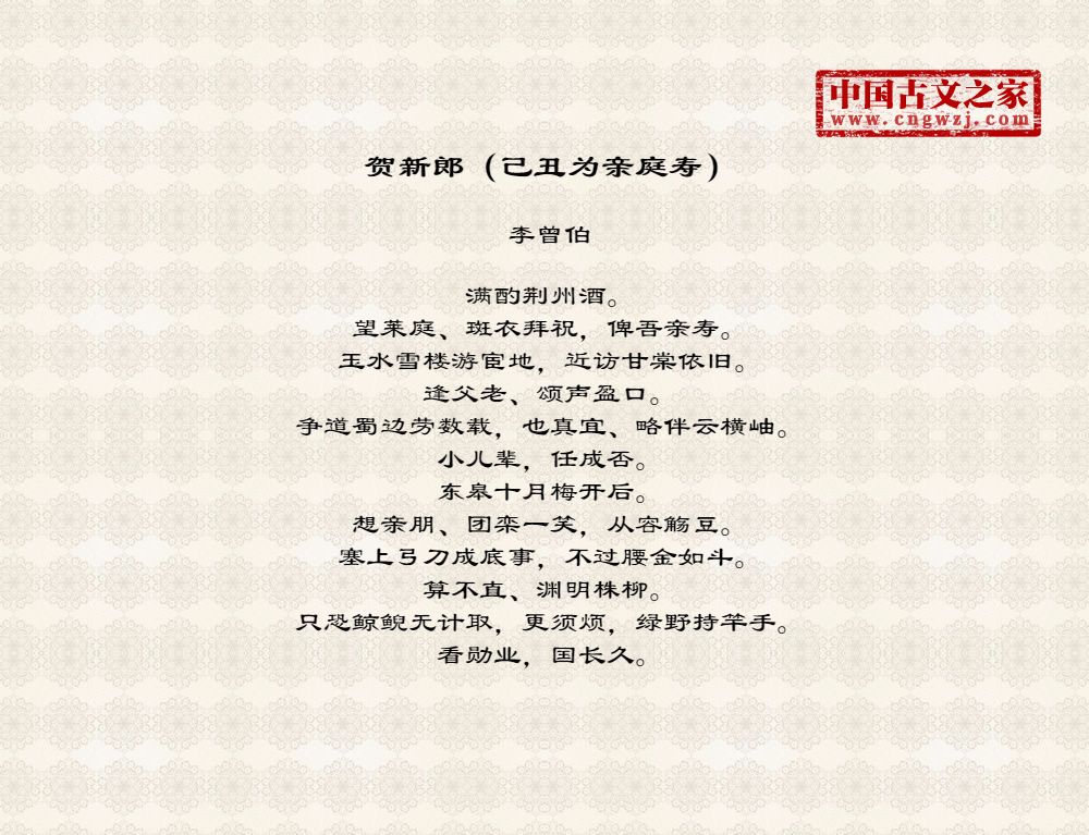 李曾伯(1198~1265至1275间)南宋词人。字长孺,号可斋。原籍覃怀(今河南沁阳附近)。南渡后寓居嘉兴(今属浙江)。