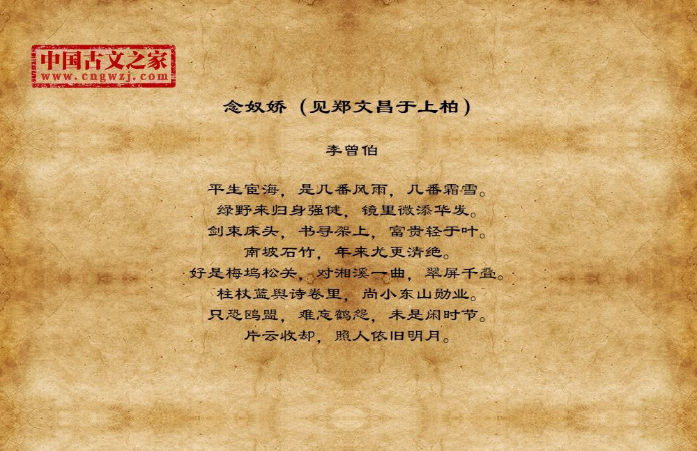 李曾伯(1198~1265至1275间)南宋词人。字长孺,号可斋。原籍覃怀(今河南沁阳附近)。南渡后寓居嘉兴(今属浙江)。