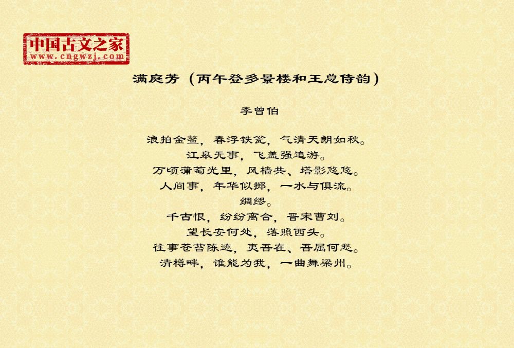《满庭芳(丙午登多景楼和王总侍韵)》的原文打印版(李曾伯)