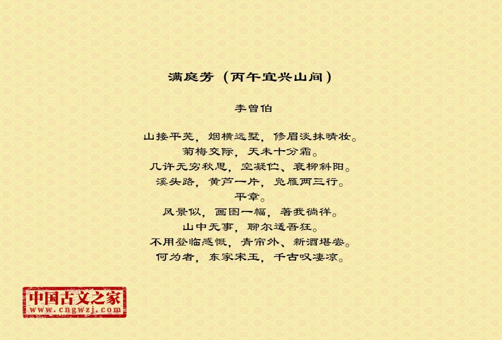 李曾伯(1198~1265至1275间)南宋词人。字长孺,号可斋。原籍覃怀(今河南沁阳附近)。南渡后寓居嘉兴(今属浙江)。