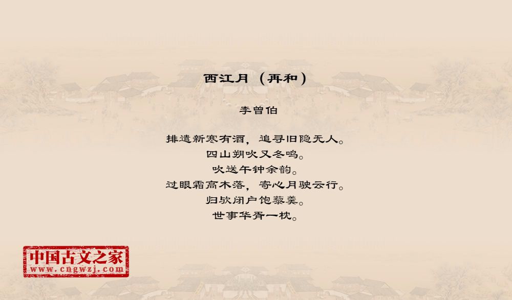 李曾伯(1198~1265至1275间)南宋词人。字长孺,号可斋。原籍覃怀(今河南沁阳附近)。南渡后寓居嘉兴(今属浙江)。
