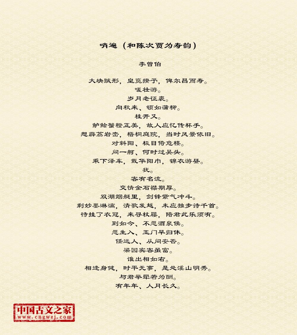李曾伯(1198~1265至1275间)南宋词人。字长孺,号可斋。原籍覃怀(今河南沁阳附近)。南渡后寓居嘉兴(今属浙江)。