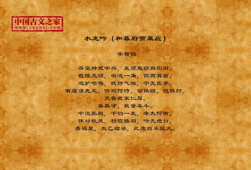 李曾伯(1198~1265至1275间)南宋词人。字长孺,号可斋。原籍覃怀(今河南沁阳附近)。南渡后寓居嘉兴(今属浙江)。