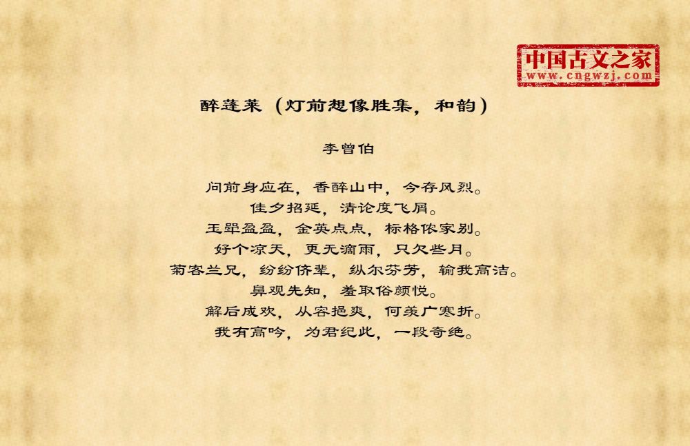 李曾伯(1198~1265至1275间)南宋词人。字长孺,号可斋。原籍覃怀(今河南沁阳附近)。南渡后寓居嘉兴(今属浙江)。