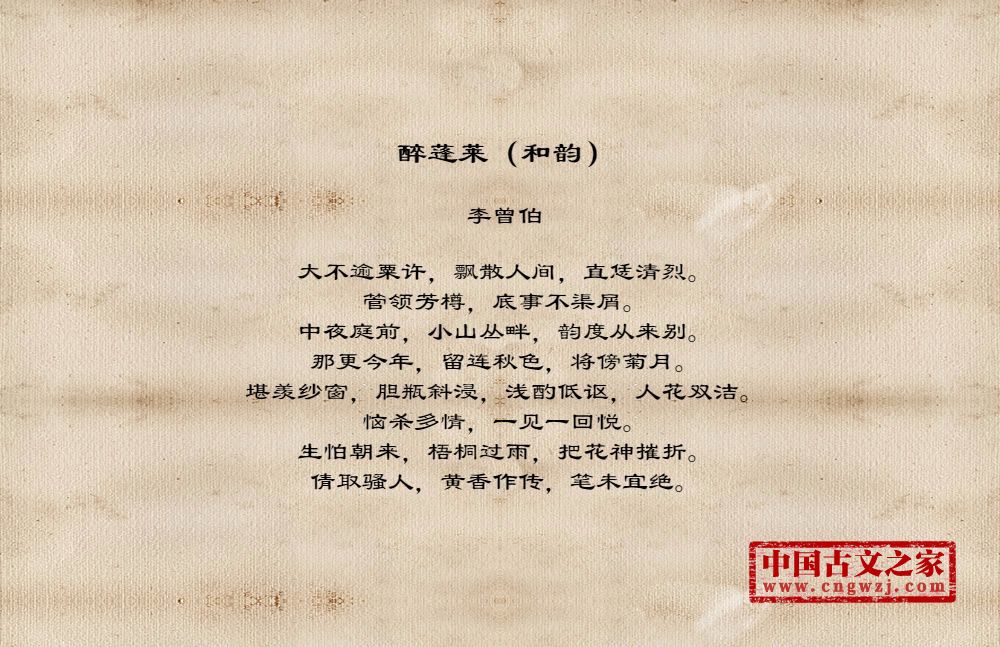 李曾伯(1198~1265至1275间)南宋词人。字长孺,号可斋。原籍覃怀(今河南沁阳附近)。南渡后寓居嘉兴(今属浙江)。