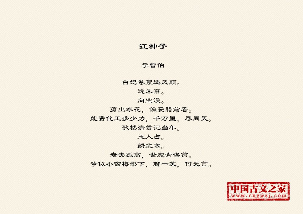 李曾伯(1198~1265至1275间)南宋词人。字长孺,号可斋。原籍覃怀(今河南沁阳附近)。南渡后寓居嘉兴(今属浙江)。