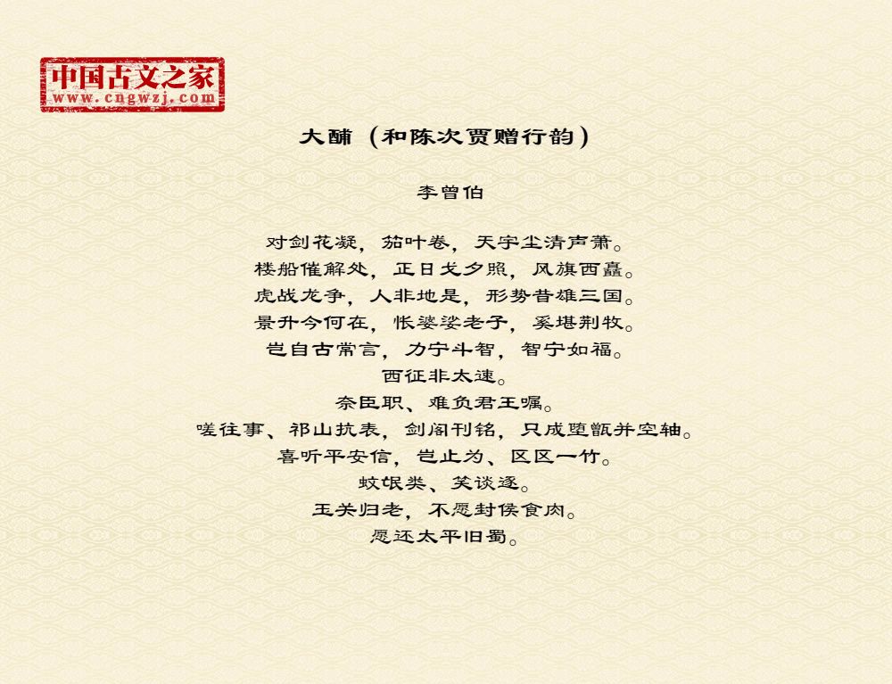 李曾伯(1198~1265至1275间)南宋词人。字长孺,号可斋。原籍覃怀(今河南沁阳附近)。南渡后寓居嘉兴(今属浙江)。