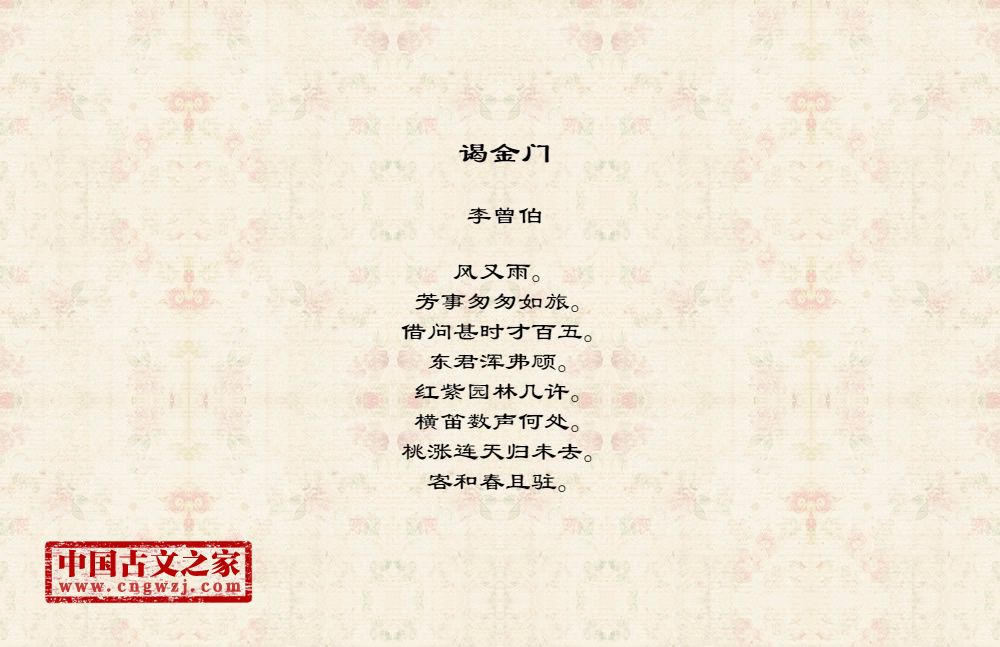 风又雨。芳事匆匆如旅。借问甚时才百五。东君浑弗顾。红紫园林几许。横笛数声何处。桃涨连天归未去。客和春且驻。