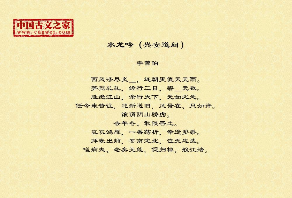 李曾伯(1198~1265至1275间)南宋词人。字长孺,号可斋。原籍覃怀(今河南沁阳附近)。南渡后寓居嘉兴(今属浙江)。