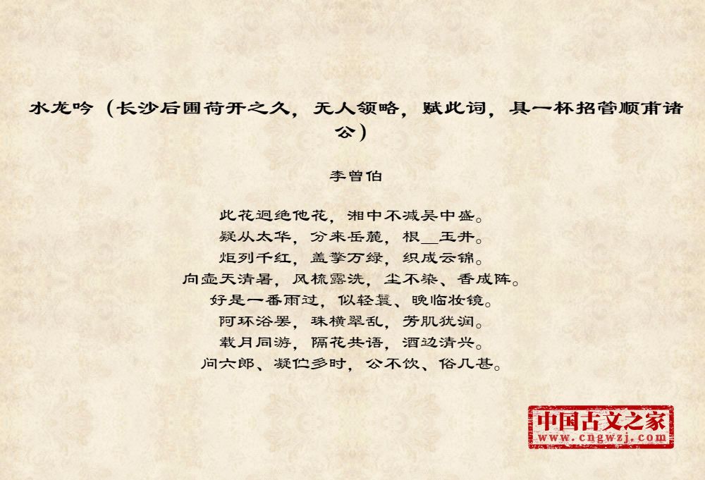 《水龙吟(长沙后圃荷开之久,无人领略,赋此词,具一杯招管顺甫诸公)》的原文打印版(李曾伯)