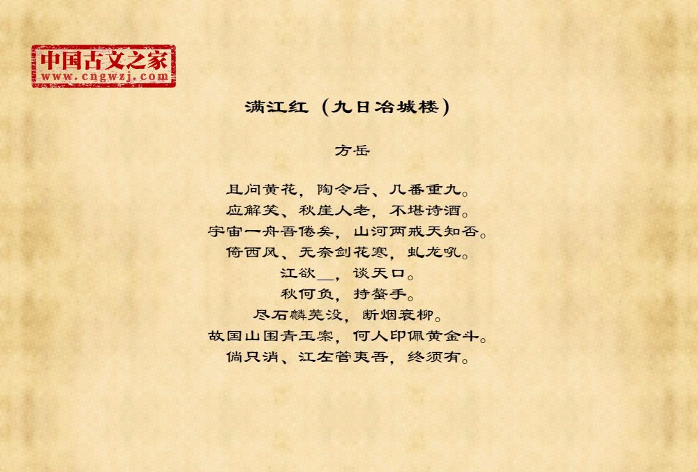 且问黄花,陶令后、几番重九。应解笑、秋崖人老,不堪诗酒。宇宙一舟吾倦矣,山河两戒天知否。倚西风、无奈剑花寒,虬龙吼。江欲_,谈天口。秋何负,持螯手。尽石麟芜没,断烟衰柳。故国山围青玉案,何人印佩黄金斗。倘只消、江左管夷吾,终须有。