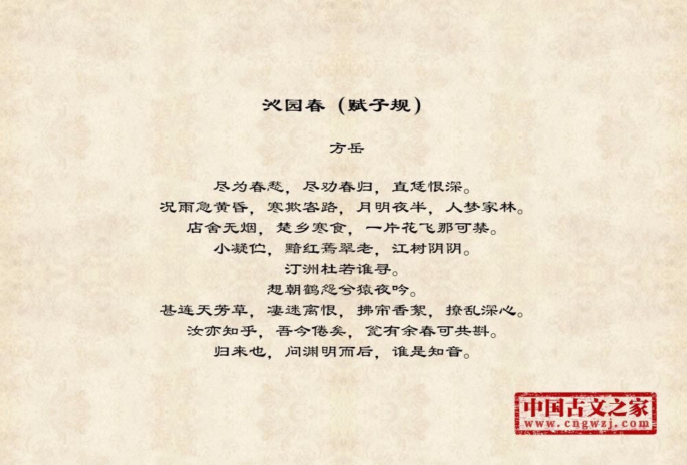 尽为春愁,尽劝春归,直恁恨深。况雨急黄昏,寒欺客路,月明夜半,人梦家林。店舍无烟,楚乡寒食,一片花飞那可禁。小凝伫,黯红蔫翠老,江树阴阴。汀洲杜若谁寻。想朝鹤怨兮猿夜吟。甚连天芳草,凄迷离恨,拂帘香絮,撩乱深心。汝亦知乎,吾今倦矣,瓮有余春可共斟。归来也,问渊明而后,谁是知音。