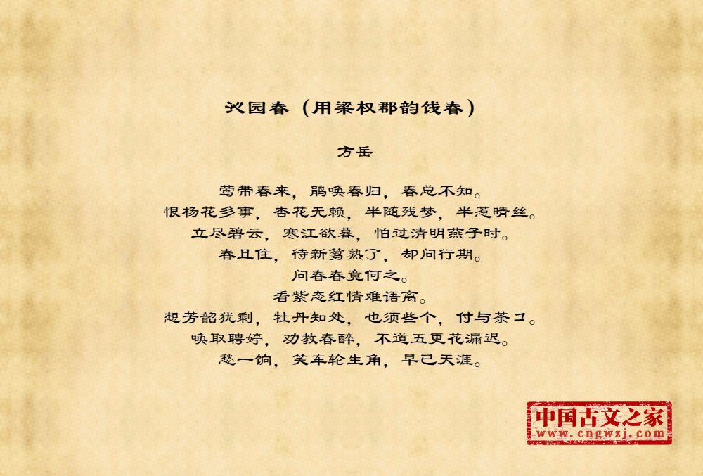 莺带春来,鹃唤春归,春总不知。恨杨花多事,杏花无赖,半随残梦,半惹晴丝。立尽碧云,寒江欲暮,怕过清明燕子时。春且住,待新篘熟了,却问行期。问春春竟何之。看紫态红情难语离。想芳韶犹剩,牡丹知处,也须些个,付与荼コ。唤取聘婷,劝教春醉,不道五更花漏迟。愁一饷,笑车轮生角,早已天涯。