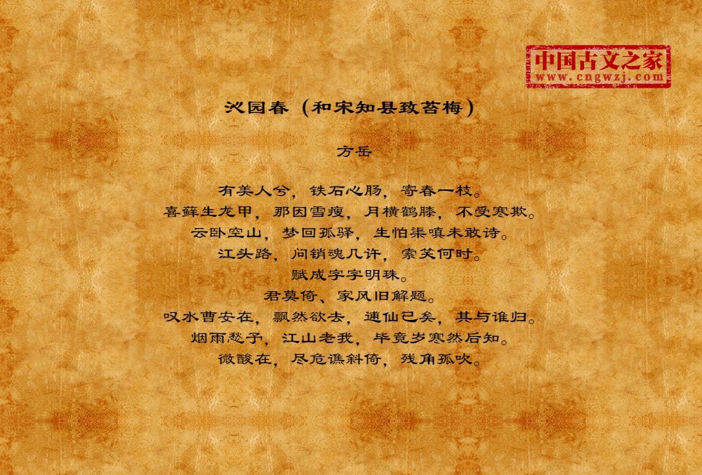 有美人兮,铁石心肠,寄春一枝。喜藓生龙甲,那因雪瘦,月横鹤膝,不受寒欺。云卧空山,梦回孤驿,生怕渠嗔未敢诗。江头路,问销魂几许,索笑何时。赋成字字明珠。君莫倚、家风旧解题。叹水曹安在,飘然欲去,逋仙已矣,其与谁归。烟雨愁予,江山老我,毕竟岁寒然后知。微酸在,尽危谯斜倚,残角孤吹。