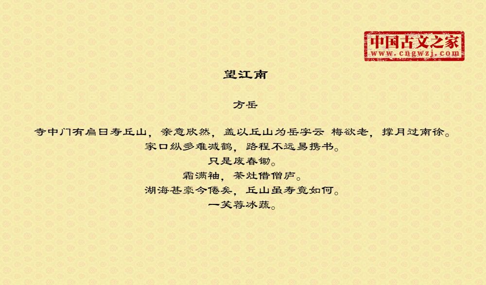 寺中门有扁曰寿丘山,亲意欣然,盖以丘山为岳字云 梅欲老,撑月过南徐。家口纵多难减鹤,路程不远易携书。只是废春锄。霜满袖,茶灶借僧庐。湖海甚豪今倦矣,丘山虽寿竟如何。一笑荐冰蔬。