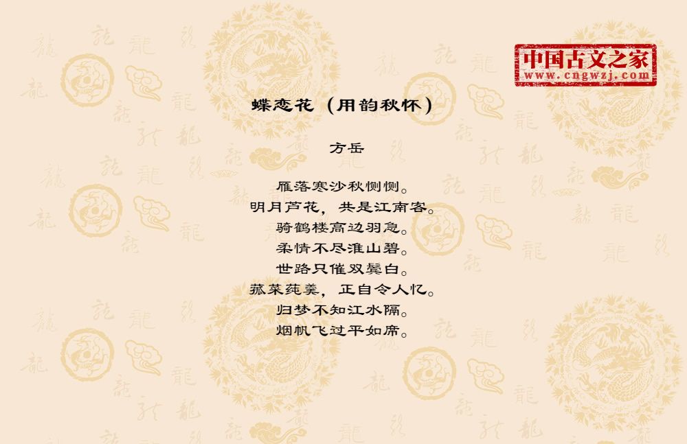 雁落寒沙秋恻恻。明月芦花,共是江南客。骑鹤楼高边羽急。柔情不尽淮山碧。世路只催双鬓白。菰菜莼羹,正自令人忆。归梦不知江水隔。烟帆飞过平如席。