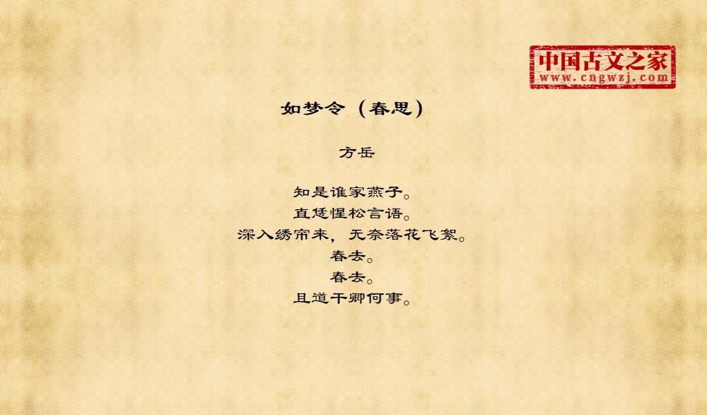 知是谁家燕子。直恁惺松言语。深入绣帘来,无奈落花飞絮。春去。春去。且道干卿何事。