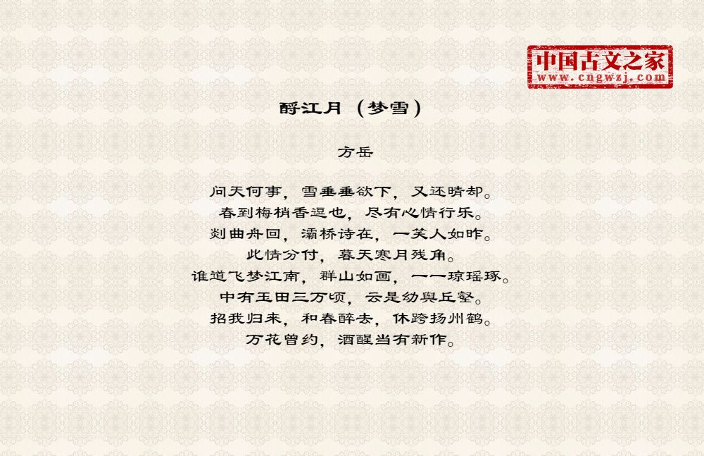 问天何事,雪垂垂欲下,又还晴却。春到梅梢香逗也,尽有心情行乐。剡曲舟回,灞桥诗在,一笑人如昨。此情分付,暮天寒月残角。谁道飞梦江南,群山如画,一一琼瑶琢。中有玉田三万顷,云是幼舆丘壑。招我归来,和春醉去,休跨扬州鹤。万花曾约,酒醒当有新作。