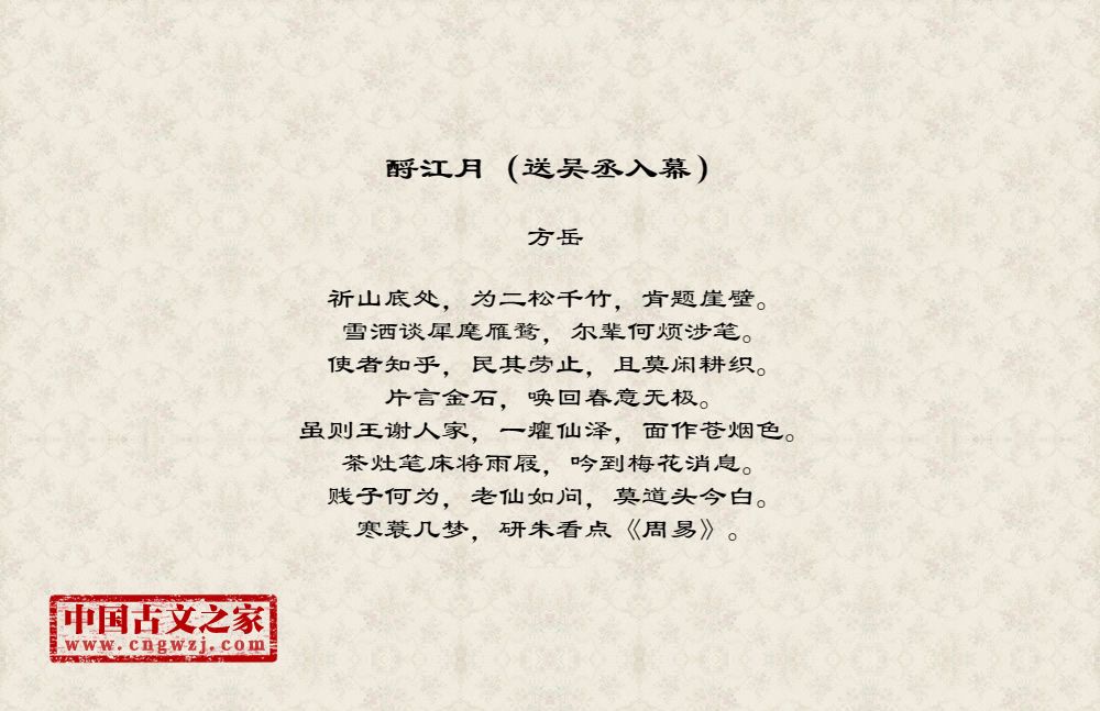 方岳(1199~1262),南宋诗人、词人。字巨山,号秋崖。祁门(今属安徽)人。绍定五年(1232)进士,授淮东安抚司□官。淳□中,以工部郎官充任赵葵