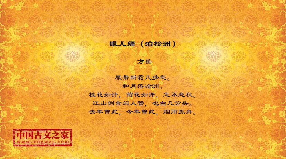 雁带新霜几多愁。和月落沧洲。桂花如计,菊花如许,怎不悲秋。江山例合闲人管,也白几分头。去年曾此,今年曾此,烟雨孤舟。