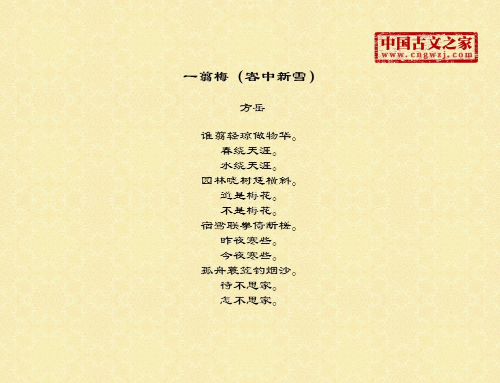 谁翦轻琼做物华。春绕天涯。水绕天涯。园林晓树恁横斜。道是梅花。不是梅花。宿鹭联拳倚断槎。昨夜寒些。今夜寒些。孤舟蓑笠钓烟沙。待不思家。怎不思家。