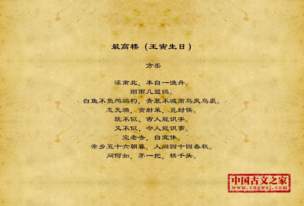 溪南北,本自一渔舟。烟雨几盟鸥。白鱼不负鸬鹚杓,青蓑不减肃鸟爽鸟裘。怎无端,贪射策,觅封侯。既不似、古人能识字。又不似、今人能识事。空老去,自宜休。帝乡五十六朝暮,人间四十四春秋。问何如,茅一把,橘千头。