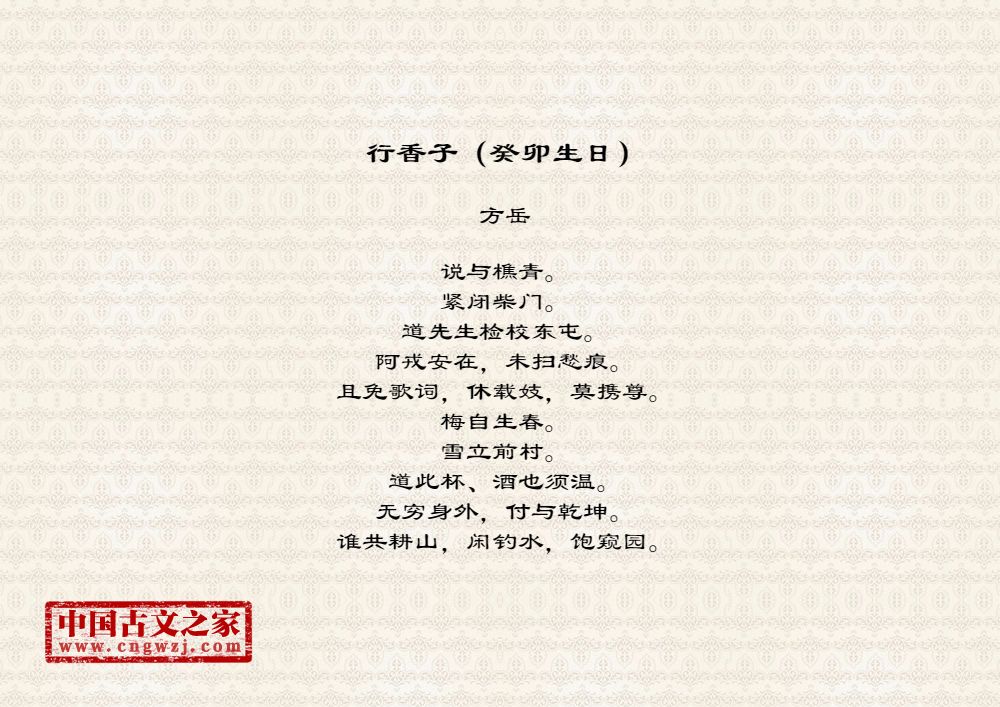 说与樵青。紧闭柴门。道先生检校东屯。阿戎安在,未扫愁痕。且免歌词,休载妓,莫携尊。梅自生春。雪立前村。道此杯、酒也须温。无穷身外,付与乾坤。谁共耕山,闲钓水,饱窥园。