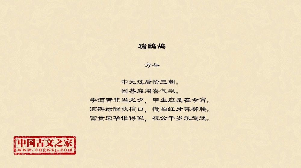 中元过后恰三朝。因甚庭闱喜气飘。李谪若非当此夕,申生应是在今宵。满斟绿醑歌檀口,慢拍红牙舞柳腰。富贵荣华谁得似,祝公千岁乐逍遥。