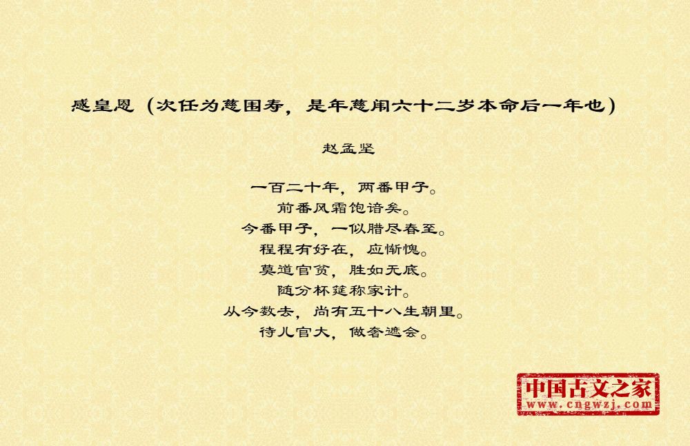 《感皇恩(次任为慈围寿,是年慈闱六十二岁本命后一年也)》由赵孟坚创作