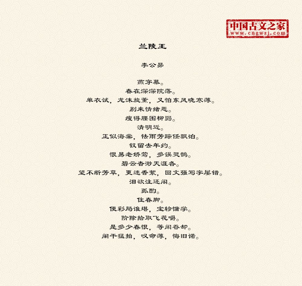 燕穿幕。春在深深院落。单衣试,龙沫旋薰,又怕东风晓寒薄。别来情绪恶。瘦得腰围柳弱。清明近。正似海棠,怯雨芳踪任飘泊。钗留去年约。恨易老娇莺,多误灵鹊。碧云杳渺天涯各。望不断芳草,更迷香絮,回文强写字屡错。泪欲注还阁。孤酌。住春脚。便彩局谁堪,宝轸慵学。阶除拾取飞花嚼。是多少春恨,等闲吞却。阑干猛拍,叹命薄,悔旧诺。