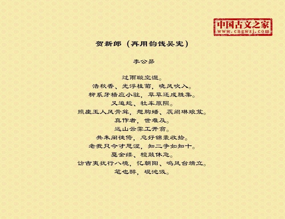 过雨璇空湿。浩秋香、光浮桂菊,晓风吹入。柳系牙樯应小驻,草草还成胜集。又追趁、牡车原隰。照座玉人风骨耸,想胸蟠、蕊阙琳琅笈。真作者,世难及。远山云雾工开翕。共朱阑徙倚,总好锦囊收拾。老我只今才思涩,知二争如知十。戛金缕、檀敲休急。访古夷犹行八境,忆朝阳、鸣凤台端立。笔也醉,砚池吸。