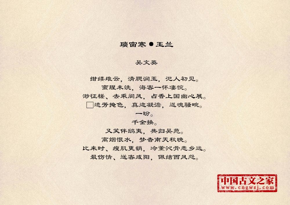 绀缕堆云,清腮润玉,汜人初见。蛮腥未洗,海客一怀凄惋。渺征槎、去乘阆风,占香上国幽心展。□遗芳掩色,真恣凝澹,返魂骚畹。一盼。千金换。又笑伴鸱夷,共归吴苑。离烟恨水,梦杳南天秋晚。比来时、瘦肌更销,冷薰沁骨悲乡远。最伤情、送客咸阳,佩结西风怨。