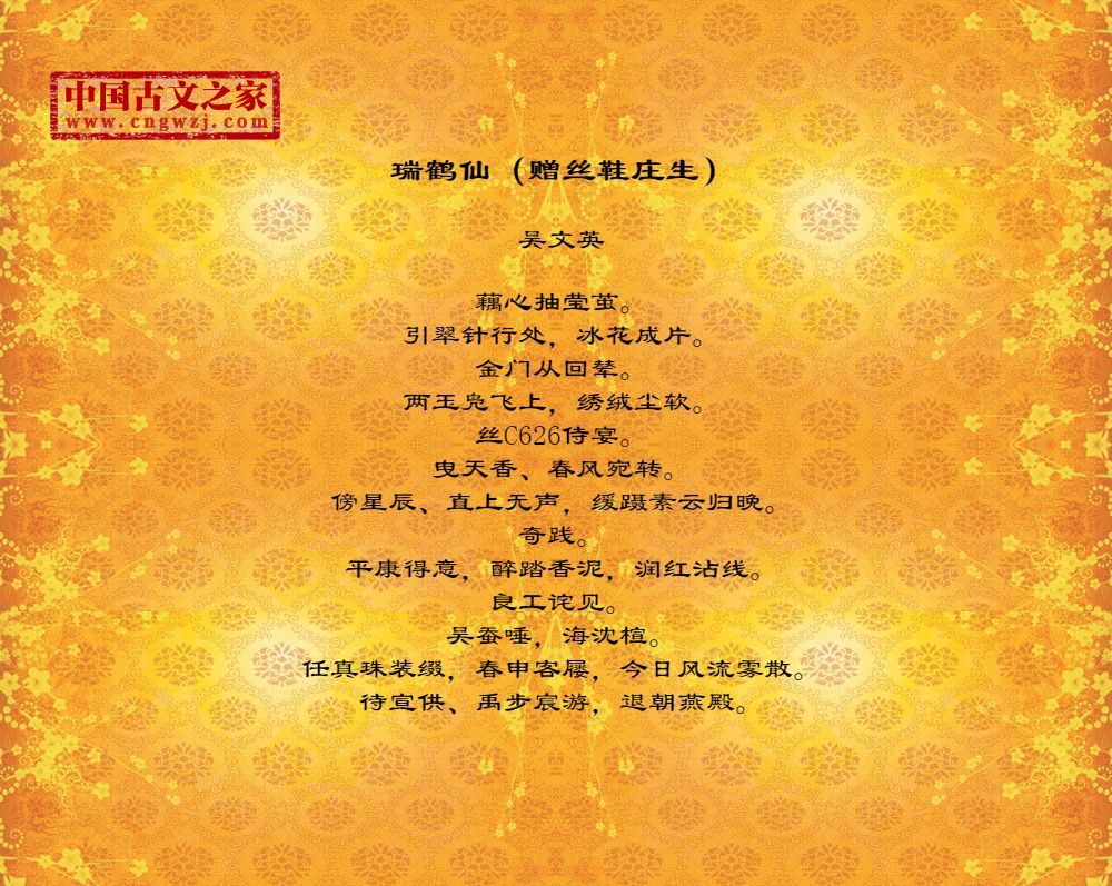 藕心抽莹茧。引翠针行处,冰花成片。金门从回辇。两玉凫飞上,绣绒尘软。丝C626侍宴。曳天香、春风宛转。傍星辰、直上无声,缓蹑素云归晚。奇践。平康得意,醉踏香泥,润红沾线。良工诧见。吴蚕唾,海沈楦。任真珠装缀,春申客屦,今日风流雾散。待宣供、禹步宸游,退朝燕殿。