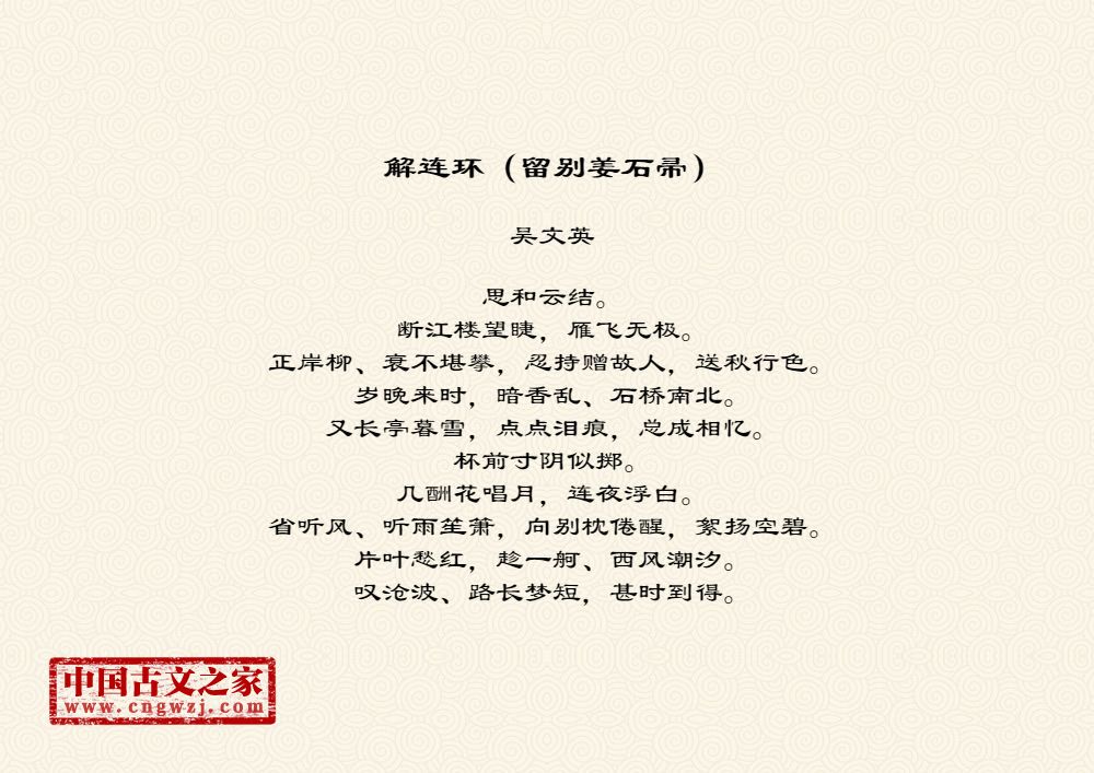 思和云结。断江楼望睫,雁飞无极。正岸柳、衰不堪攀,忍持赠故人,送秋行色。岁晚来时,暗香乱、石桥南北。又长亭暮雪,点点泪痕,总成相忆。杯前寸阴似掷。几酬花唱月,连夜浮白。省听风、听雨笙箫,向别枕倦醒,絮扬空碧。片叶愁红,趁一舸、西风潮汐。叹沧波、路长梦短,甚时到得。